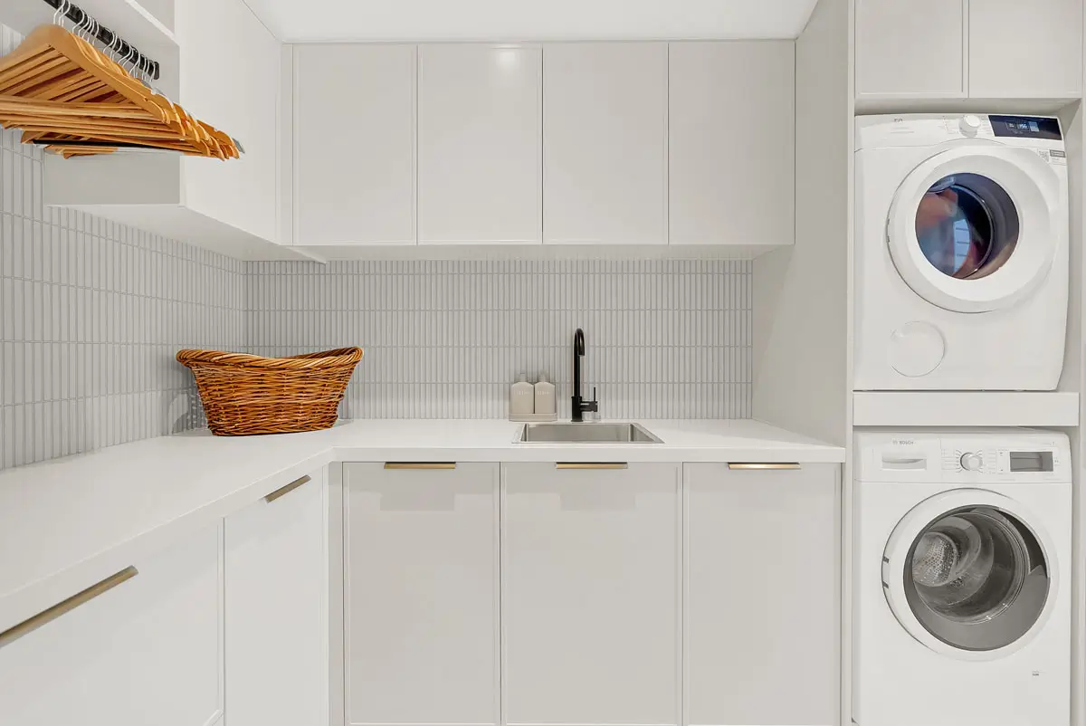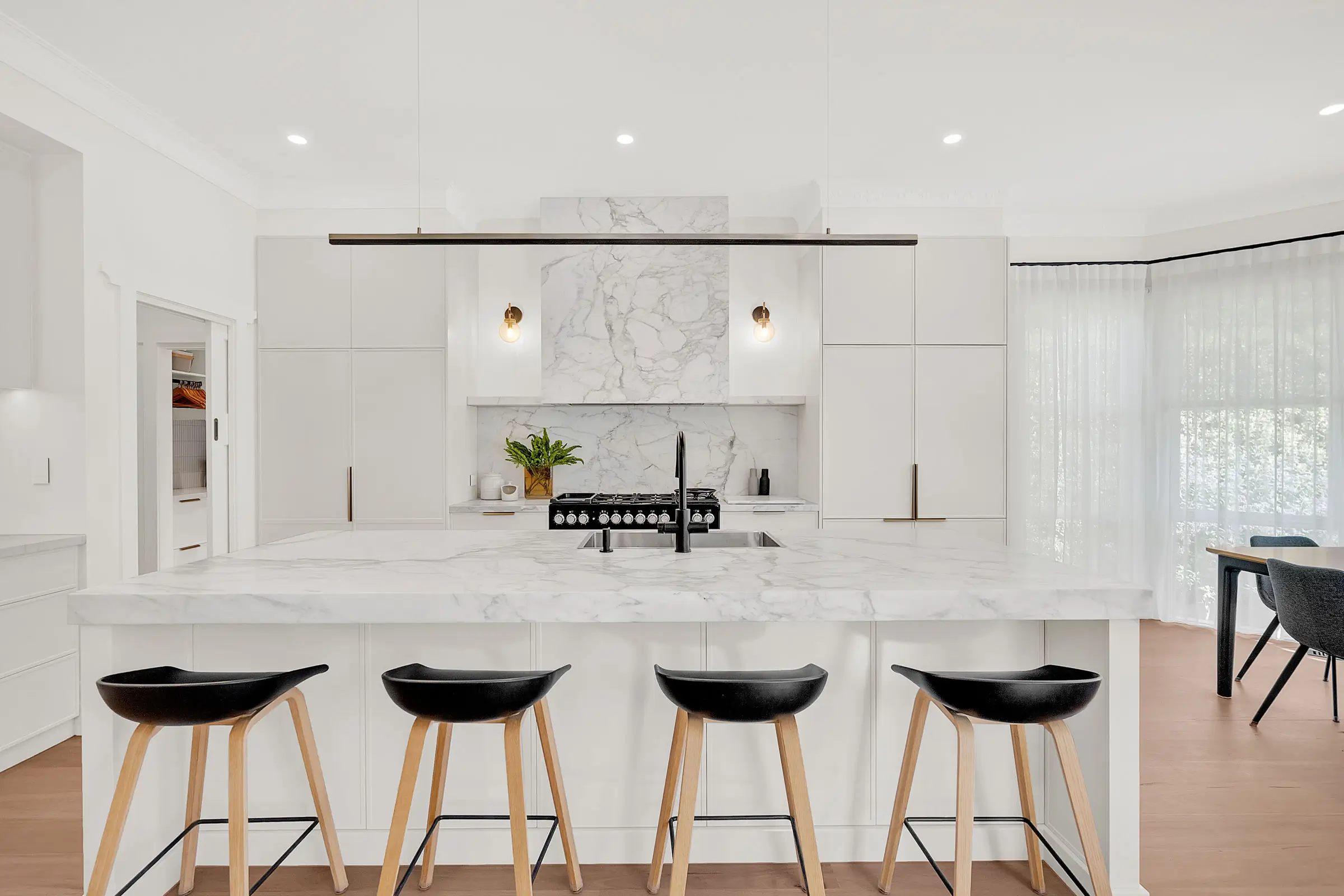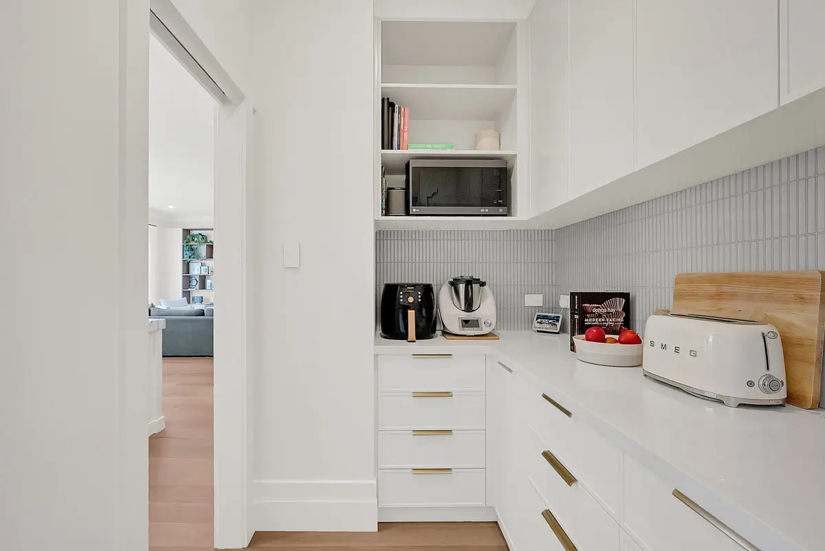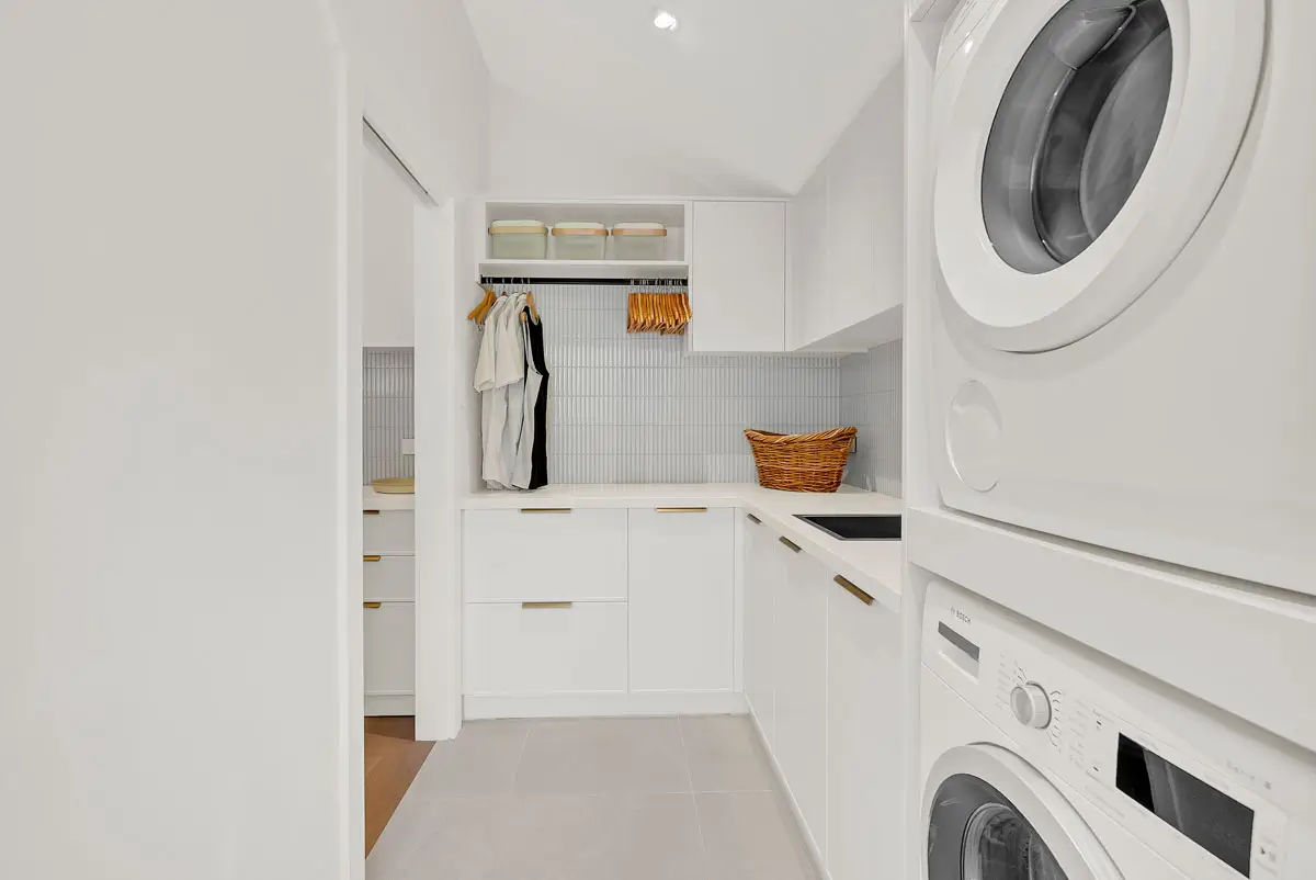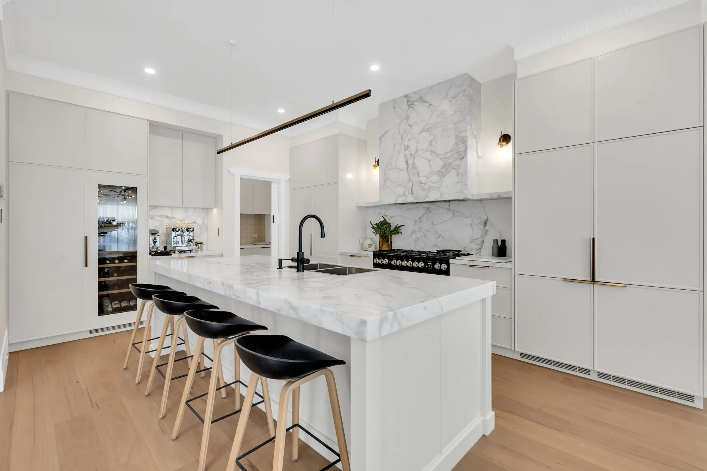 The kitchen – once an outdated U-shaped layout – was reconfigured into a contemporary, open L-shaped design to elevate both style and function. Handcrafted cabinetry in soft grey tones sets a calm tone, while the centrepiece island bench with a generous stone top anchors the space for connection and gathering – whether it’s the simple rituals of morning coffees or larger gatherings for entertaining. The stone-clad rangehood, built-in wine fridge and butler’s pantry – leading through to the beautifully renovated laundry – introduce functionality, character, and design flair enhancing the final result.