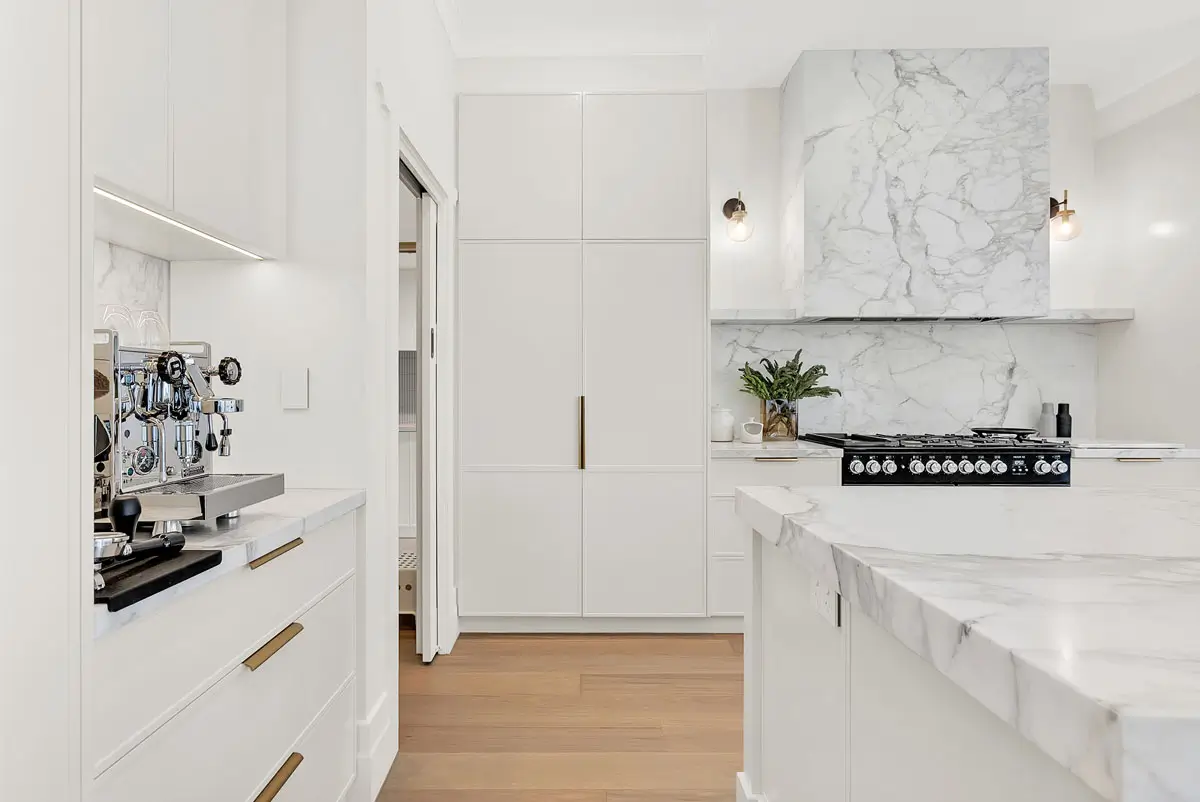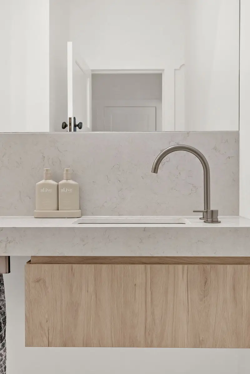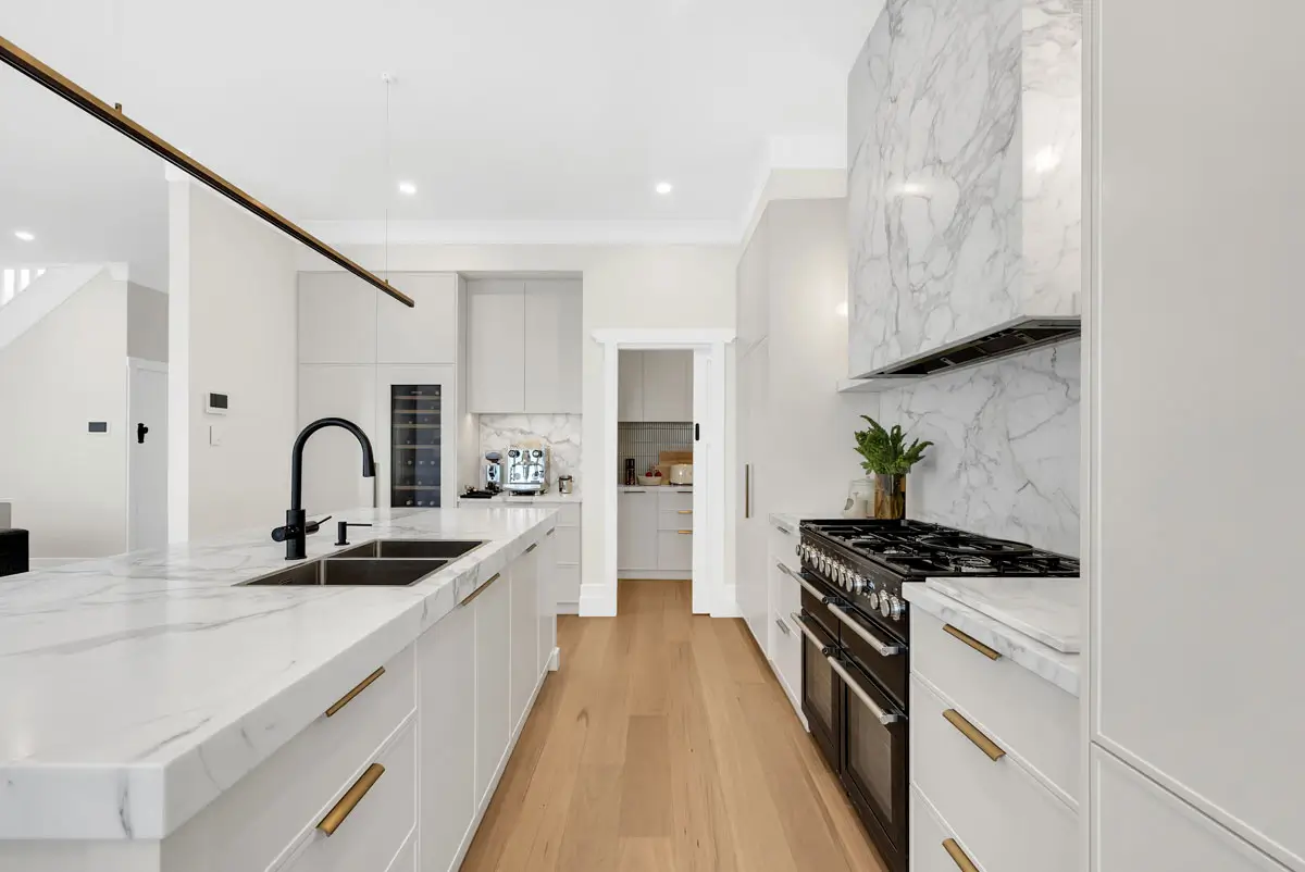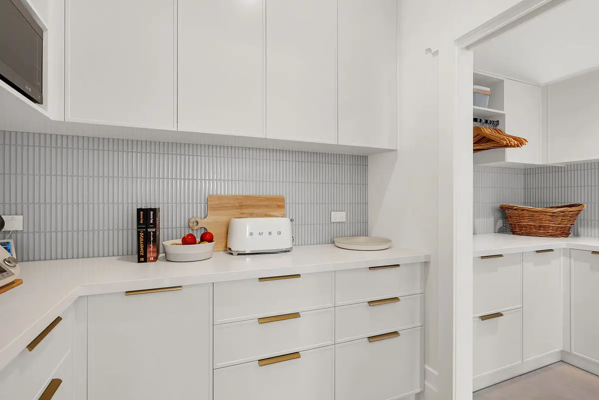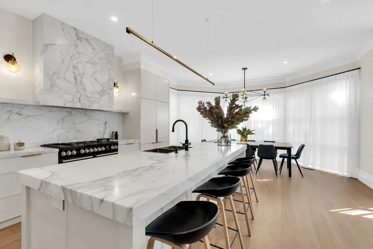 The kitchen – once an outdated U-shaped layout – was reconfigured into a contemporary, open L-shaped design to elevate both style and function. Handcrafted cabinetry in soft grey tones sets a calm tone, while the centrepiece island bench with a generous stone top anchors the space for connection and gathering – whether it’s the simple rituals of morning coffees or larger gatherings for entertaining. The stone-clad rangehood, built-in wine fridge and butler’s pantry – leading through to the beautifully renovated laundry – introduce functionality, character, and design flair enhancing the final result.