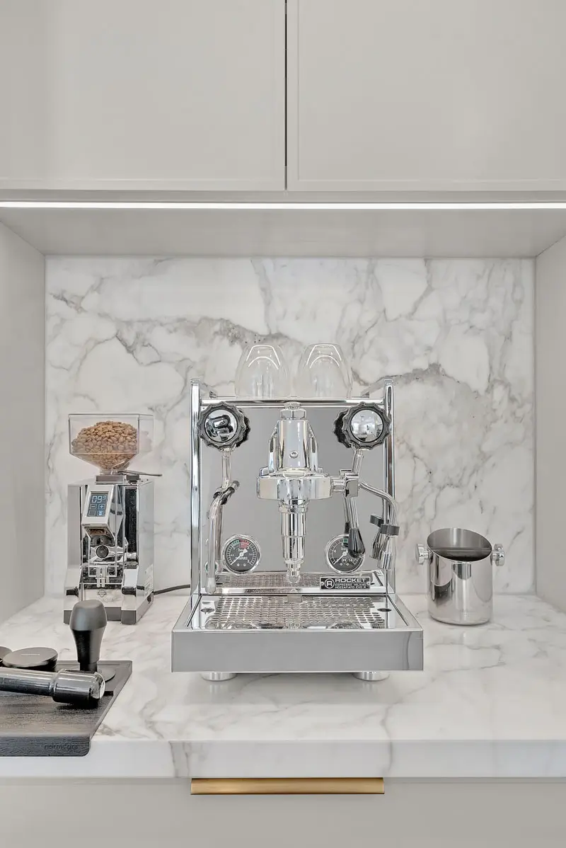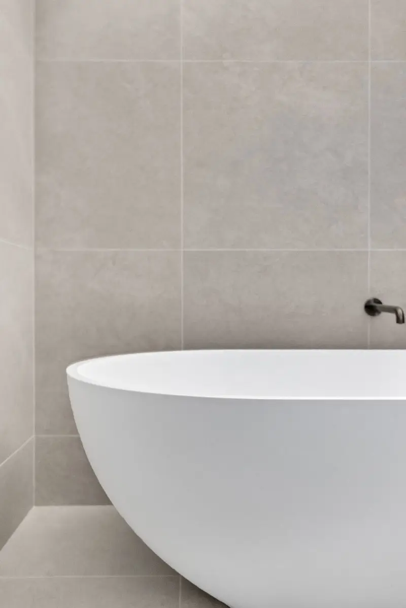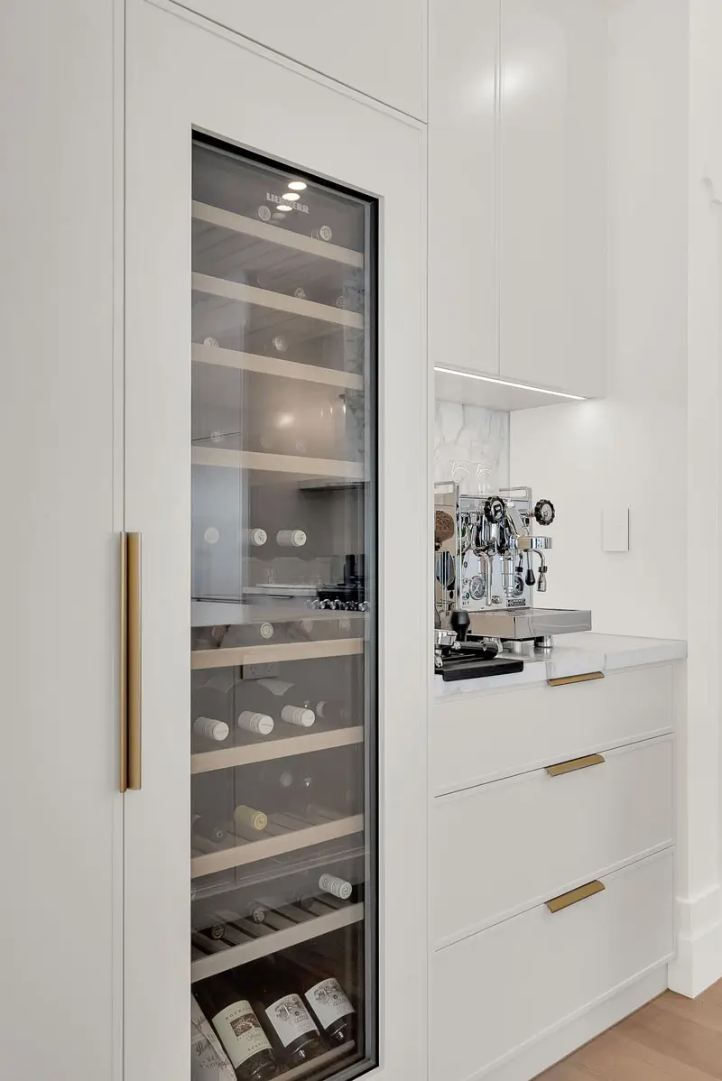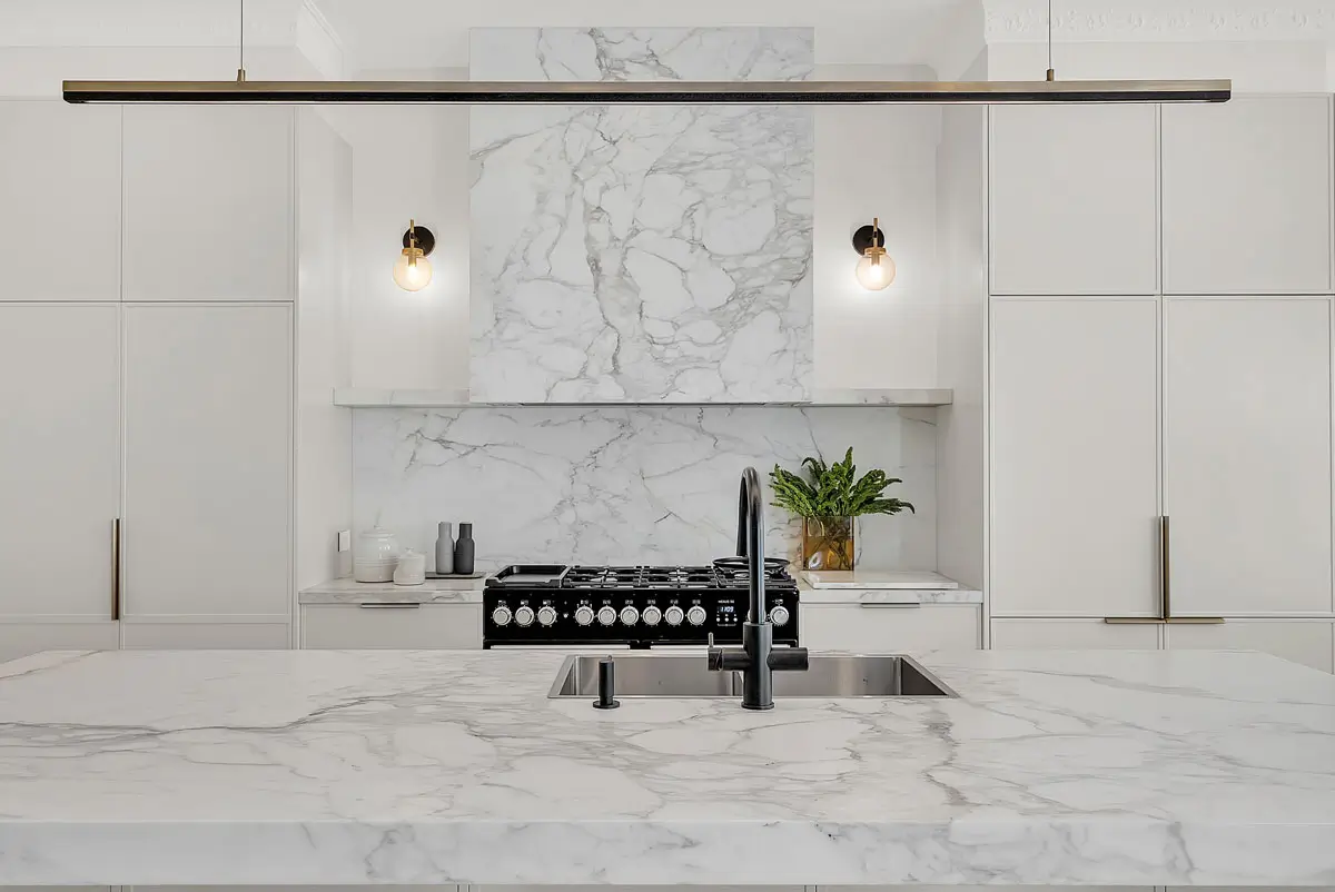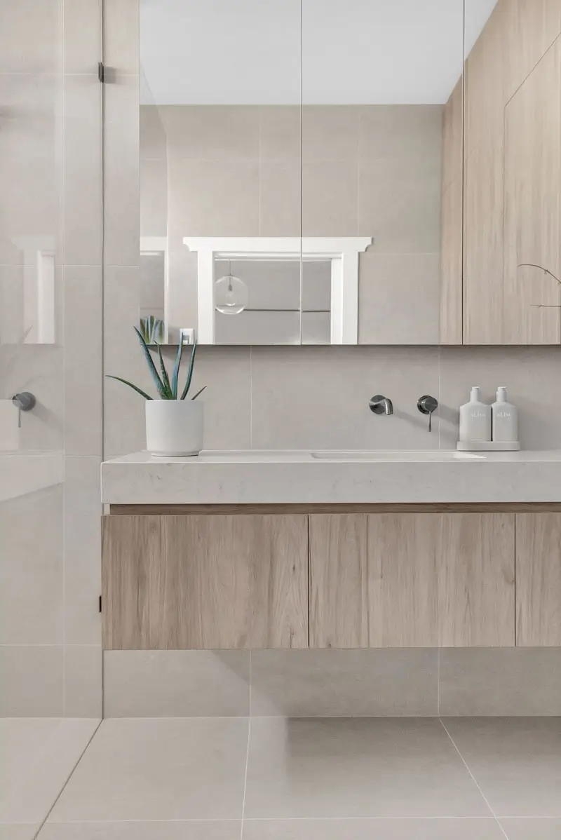 The kitchen – once an outdated U-shaped layout – was reconfigured into a contemporary, open L-shaped design to elevate both style and function. Handcrafted cabinetry in soft grey tones sets a calm tone, while the centrepiece island bench with a generous stone top anchors the space for connection and gathering – whether it’s the simple rituals of morning coffees or larger gatherings for entertaining. The stone-clad rangehood, built-in wine fridge and butler’s pantry – leading through to the beautifully renovated laundry – introduce functionality, character, and design flair enhancing the final result.