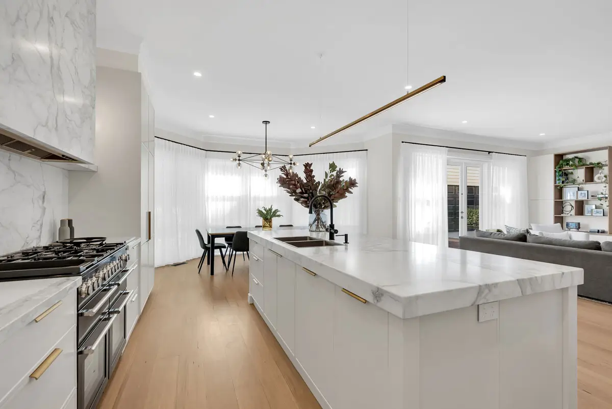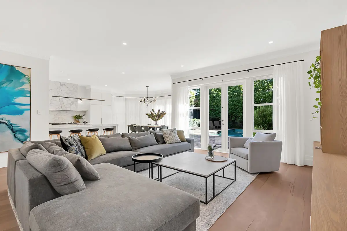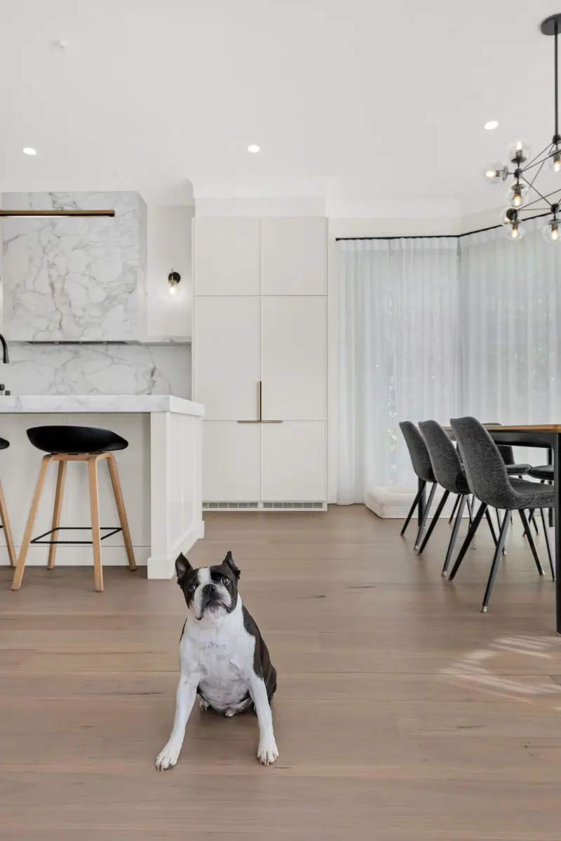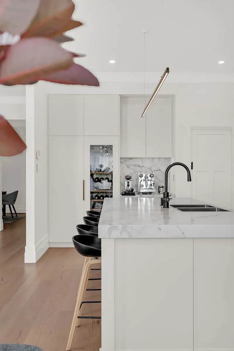 The transformation delivers a cohesive design that feels functional and effortlessly inviting. The entryway was opened up to create a more welcoming and spacious first impression, complemented by new timber flooring throughout the ground floor that unifies each space with natural warmth and flow.