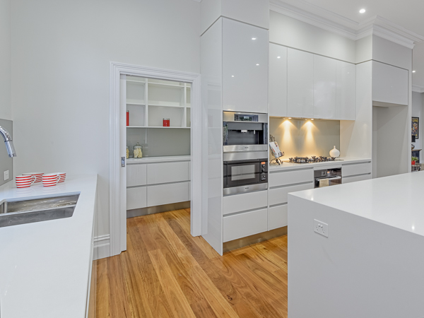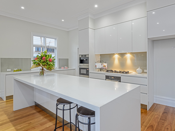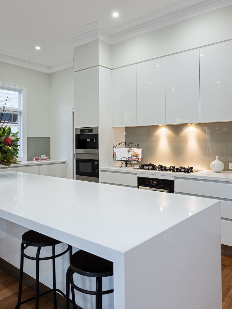 A beautifully designed kitchen with sleek edges, white colours and handless kitchen cupboards. This area was transformed into a family cooking space. A modern gas stove top together with simple stainless steel appliances, perfectly aligns with the contemporary style. The main thing about this room is the large polished island bench top, a place for family gatherings.