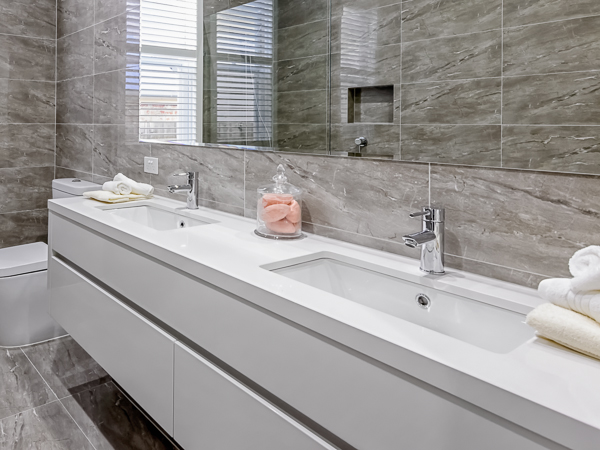 The two bathroom is guaranteed to inspire with simplistic and clean feeling. The grey tiles in both rooms are calming, neutral and naturally complements the gloss white bathroom cabinets. The double bathroom vanity units stands for functionality and the freestanding bathtub gives the room an elegant touch. To align with the rest of the room, frameless mirrors were installed.